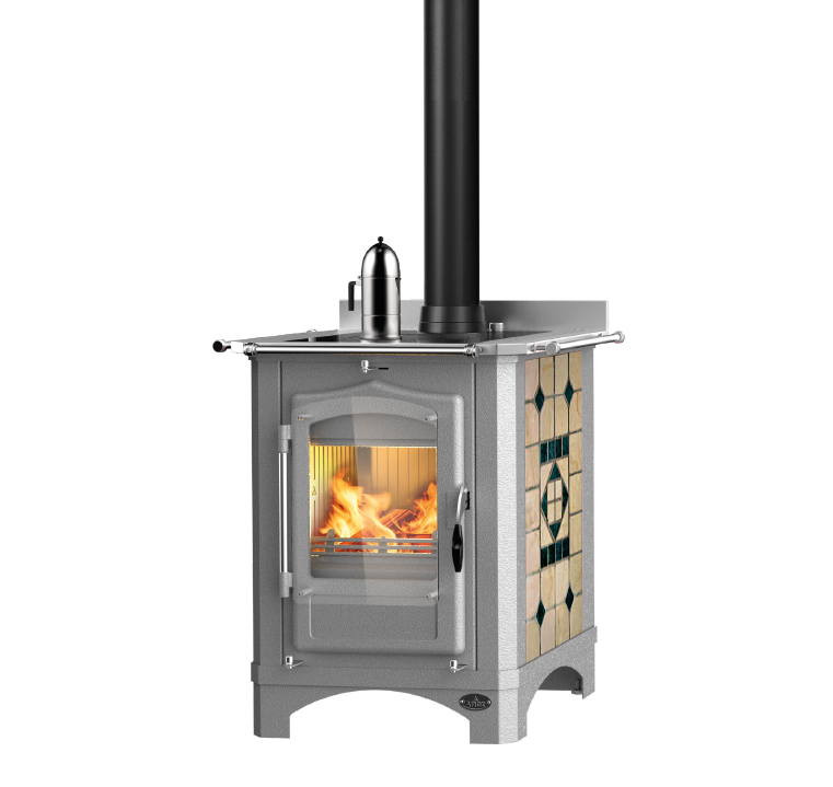 Cucina a legna salva spazio, finiture di pregio in pietra, marmo o acciaio, caratterizzata da un’elevata efficienza energetica, scarico fumi multi posizione: superiore o posteriore.