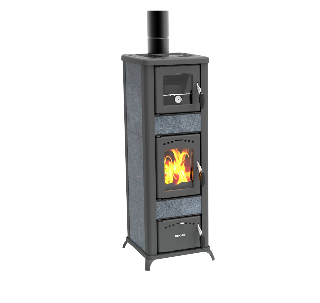 Stufa a legna dalla linea pulita e compatta, rivestimento in acciaio smaltato, testata in ghisa smaltata, focolare in ghisa e vermiculite/refrattario, cassetto recupero cenere, camera di combustione in Vermiculite, vetro ceramico.
